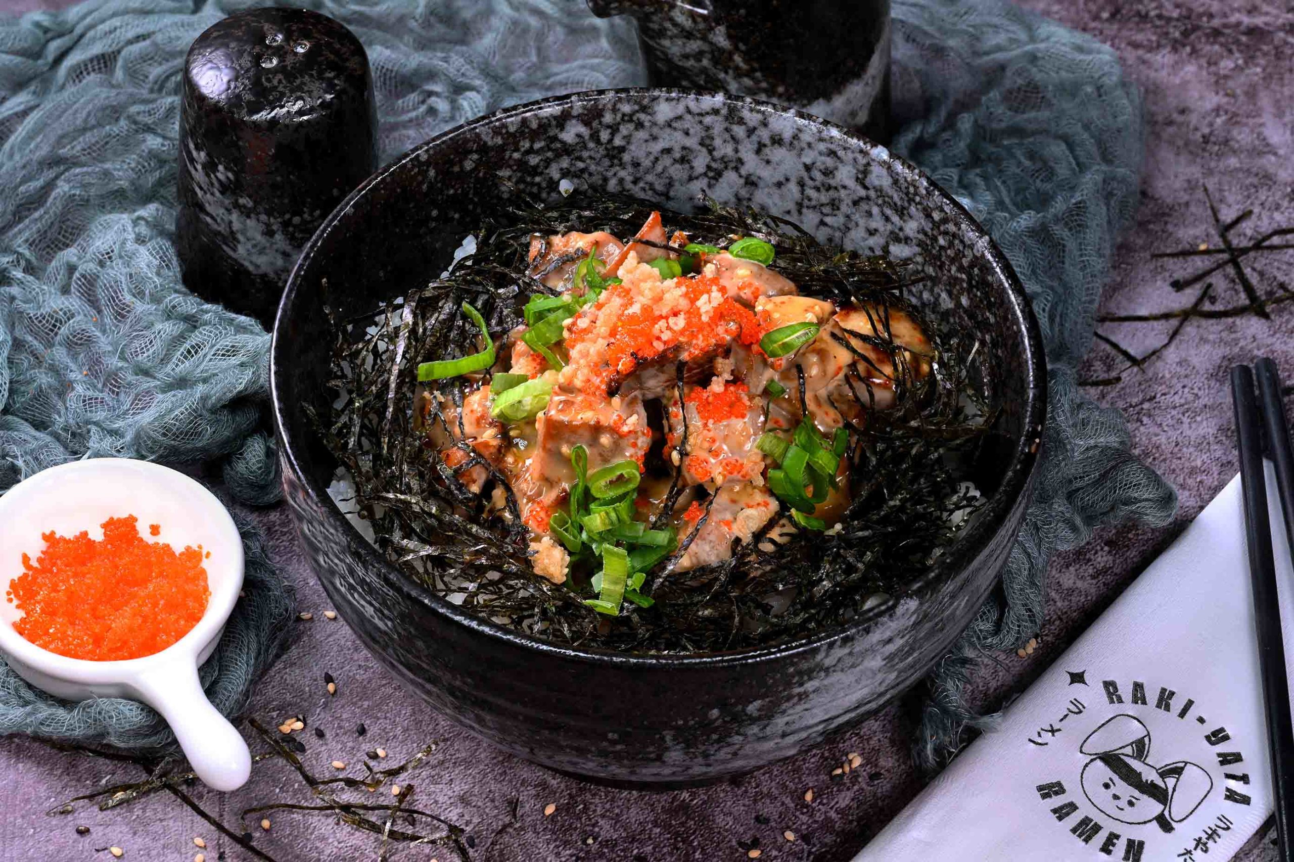 Japanese style rice bowl topped with spicy tuna and nori.
