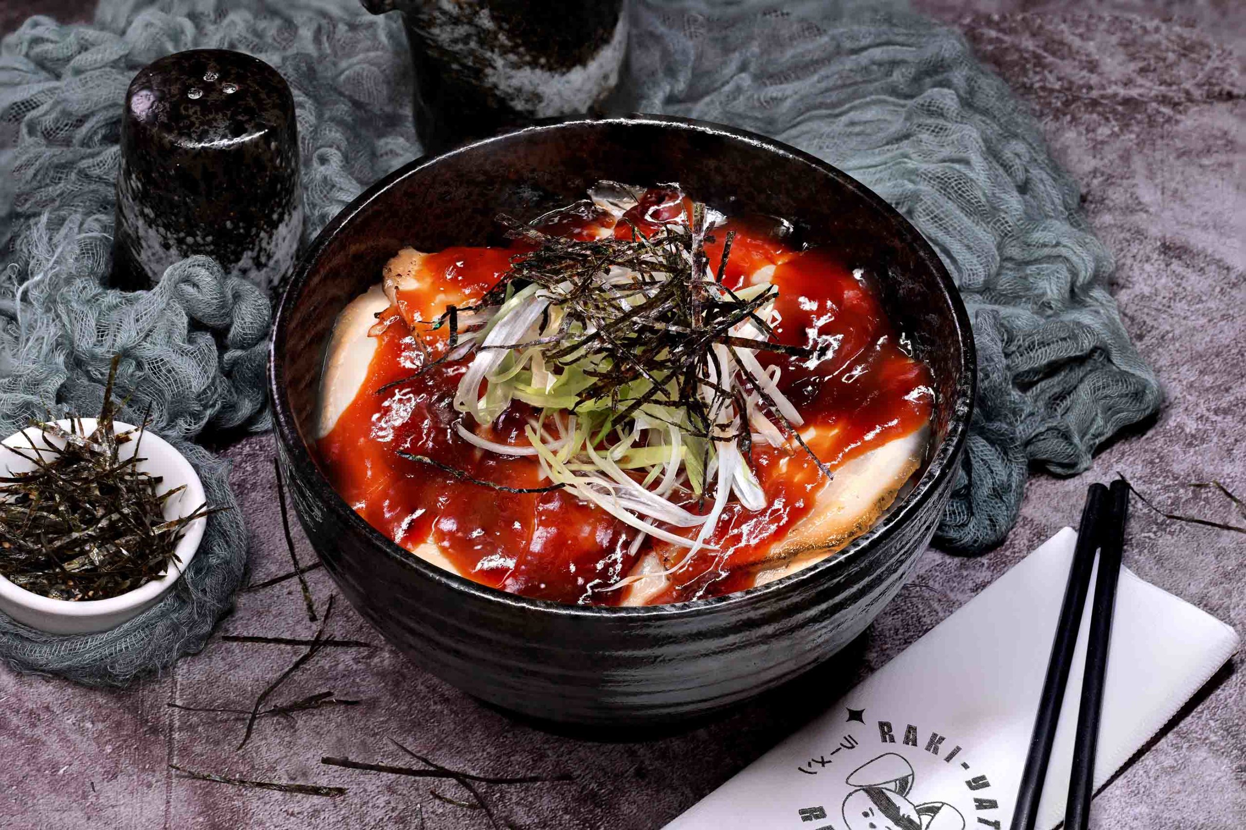 Three slices of tender delicious slices of Raki-yata pork charsiu slow-cooked sous-vide style. Topped on steamed white Japanese rice with sweet sauce.